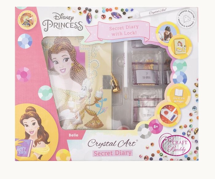 Craft Buddy Secret Diary Crystal Art Belle (CATOY-DNY001).CB Secret Diary Crystal Art, με την αγαπημένη σας Belle. Καταγράψτε τις ενδόμυχες σκέψεις σας στο αστραφτερό Crystal Art Secret Diary! Φτιάξτε αυτό το πανέμορφο ημερολόγιο χρησιμοποιώντας την χαλαρωτική και ευχάριστη τεχνική Crystal Art, η οποία είναι επίσης γνωστή ως “ζωγραφική με διαμάντια” ή “diamond art”. Η τεχνική είναι παρόμοια με τη ζωγραφική με αριθμούς. Κάθε σχέδιο Crystal Art διαθέτει ένα αριθμημένο, αυτοκόλλητο πρότυπο. Χρησιμοποιώντας το εύχρηστο στυλό pick up (περιλαμβάνεται), απλά σηκώστε τους χρωματιστούς κρυστάλλους και τοποθετήστε τους στις αντίστοιχες αριθμημένες κουκκίδες στο σχέδιό σας. Οι κρύσταλλοι στερεώνονται αμέσως! Μόλις ολοκληρώσετε την προσθήκη όλων των κρυστάλλων, το αποτέλεσμα είναι ένα υπέροχα λαμπερό και αστραφτερό Μυστικό Ημερολόγιο. Η κατασκευή ενός μυστικού ημερολογίου Crystal Art διαρκεί από 2 έως 3 ώρες. Είναι κατάλληλη για ηλικίες από 8 ετών και πάνω. Περιεχέχει: