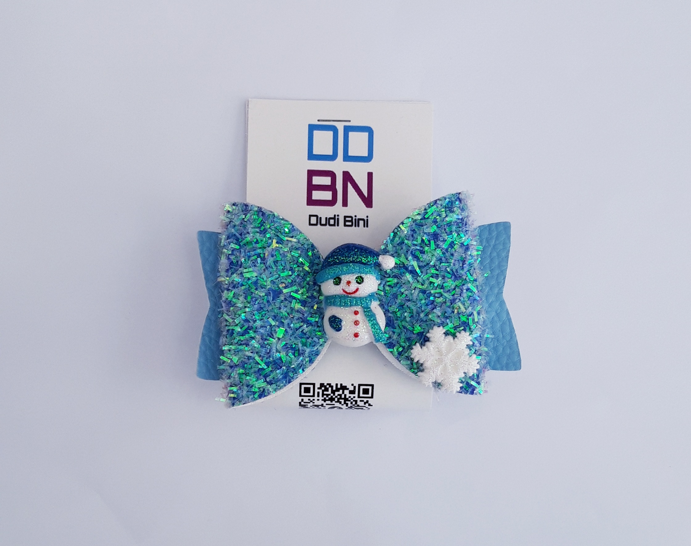 Κλιπ για τα μαλλιά μεσαίου μεγέθους σε σχέδιο φιόγκο με χιονάνθρωπο και χιονονοφάδα.