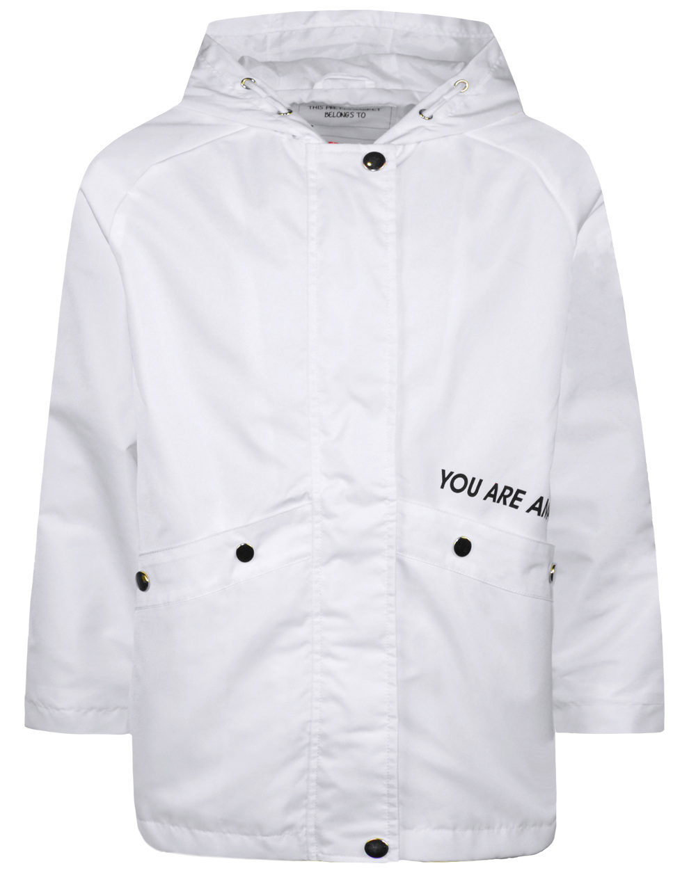 Αντιανεμικό μπουφάν μακρύ με κουκούλα,τσέπες και τύπωμα μπρος-πίσω.