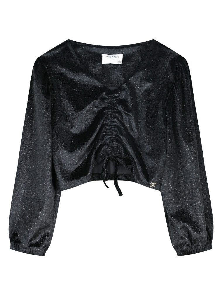 Μπλούζα βελουτέ με σούρα που ανεβαίνει μπροστά και ασημένια κλοστή που δίνει λάμψη