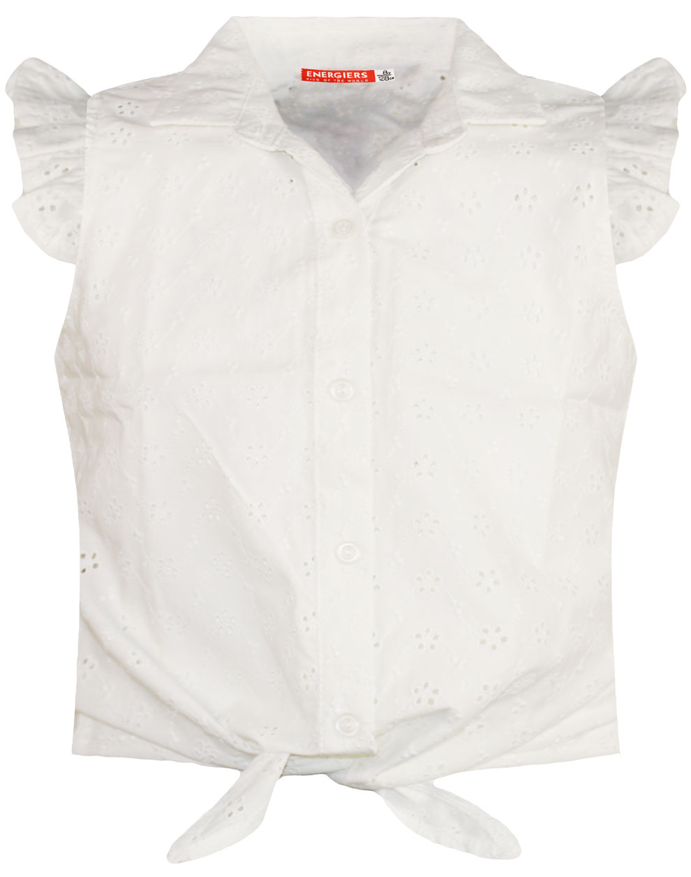 Είναι λευκό, κεντημένο και διαθέτει βολάν στα μανίκια.