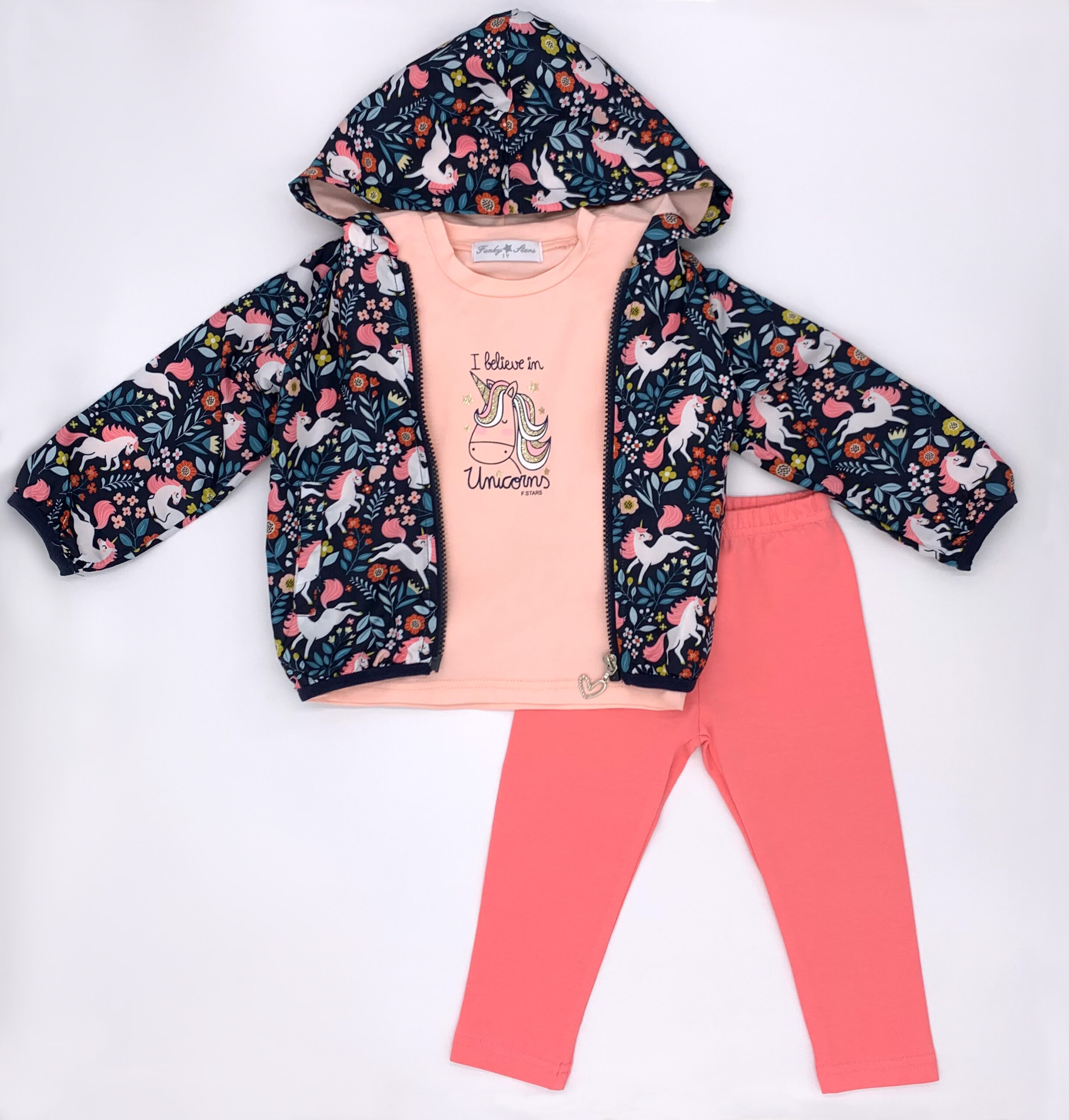 Σετ 3 τεμαχίων με αντιανεμικό μπουφάν.Περιλαμβάνει:Μπλούζα κοντομάνικη με σχέδιο μονόκερο,κολάν μακρύ μονόχρωμο και αντιανεμικό μπουφάν με τύπωμα μονόκερο και κουκούλα.