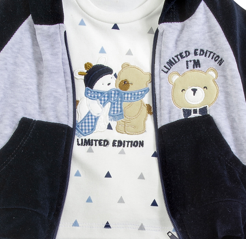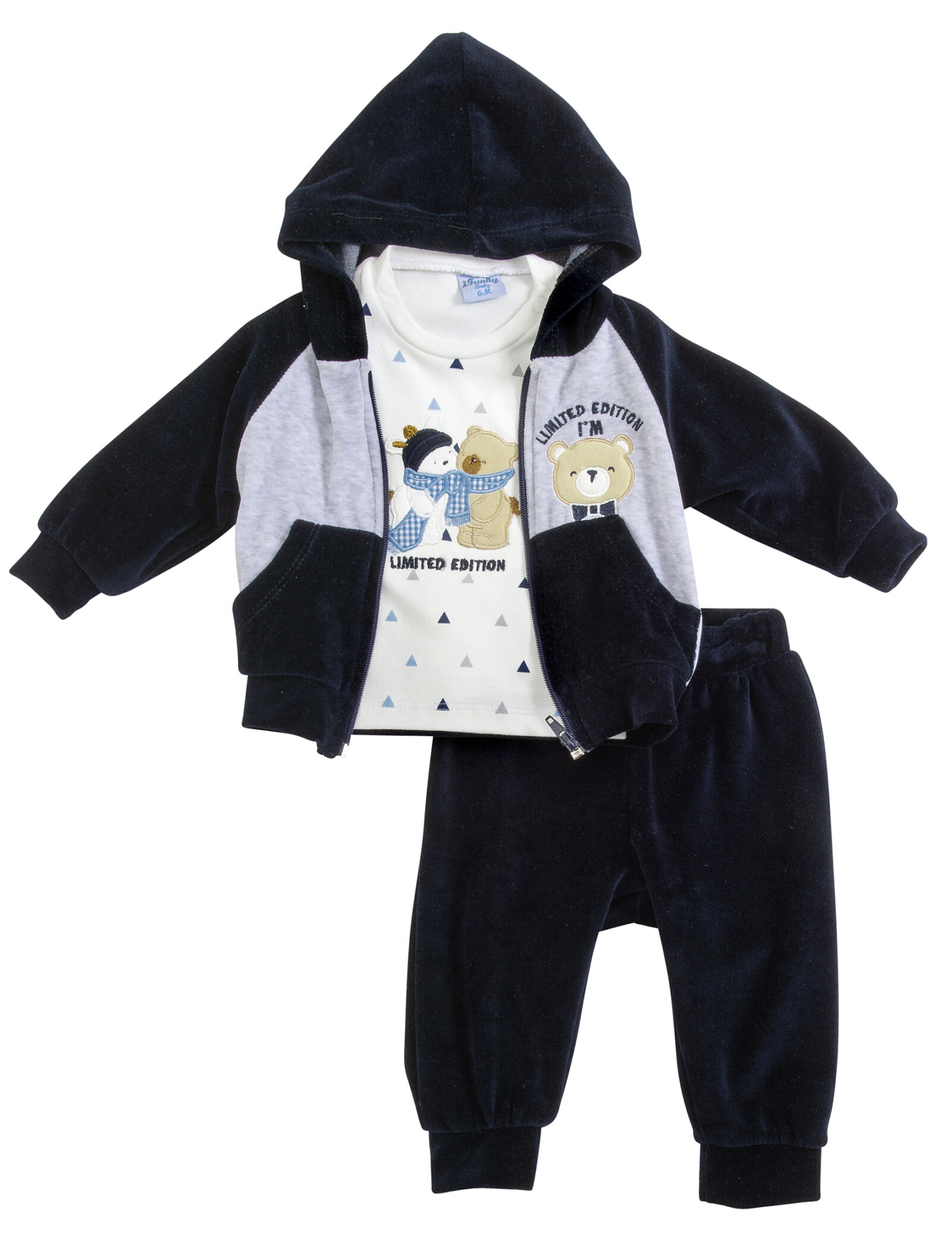 Σετ αγόρι μακρυμάνικο βελουτέ με μπλούζα/ παντελόνι/ ζακέτα (μπλούζα 100% βαμβακερό) (παντελόνι-ζακέτα βελουτέ 80%βαμβάκι 20%πολυέστερ) σε χρώμα εκρού-ανοιχτό γκρί και μπλέ με τύπωμα (μπλόυζα γεωμετρικά σχέδια και ζωάκια) (ζακέτα-ζωάκια).