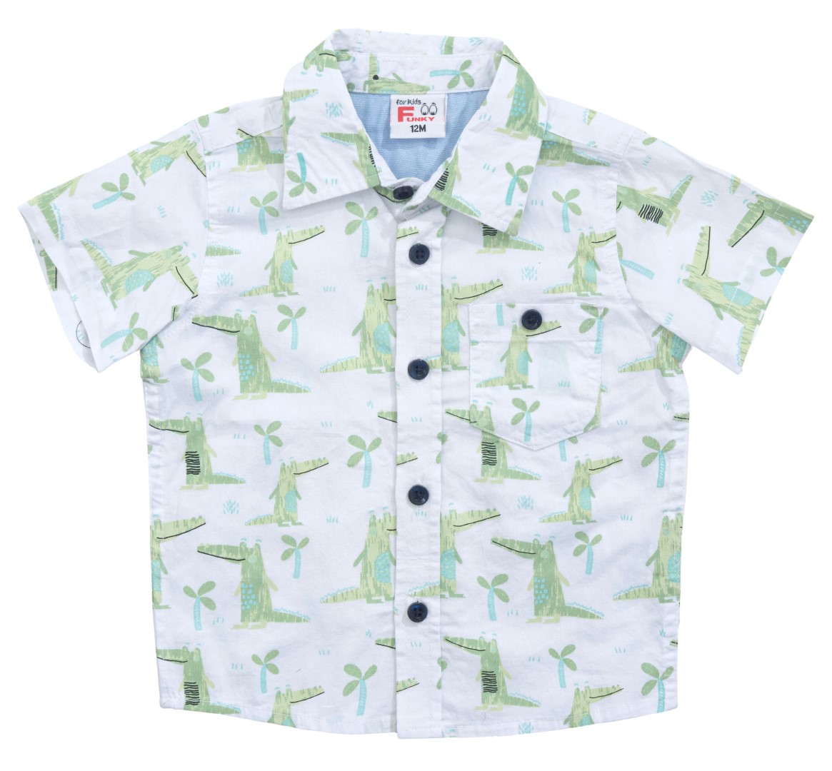 Πουκάμισο κοντομάνικο για μηνών αγόρι, σε λευκό χρώμα με ολόσωμο τύπωμα κροκόδειλο και τσέπη.