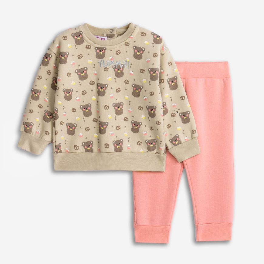 Σετ φόρμα φούτερ με τύπωμα αρκουδάκια . Η μπλούζα έχει 2 κουμπάκια πίσω για ευκολία. Κατάλληλη για τους χειμερινούς μήνες.
