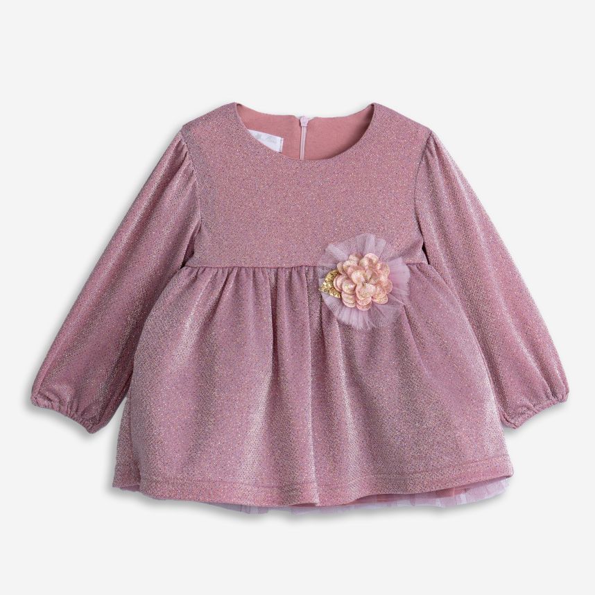 Βρεφικό φόρεμα lurex σε ροζ χρώμα και διακοσμητικό λουλούδι μπροστά