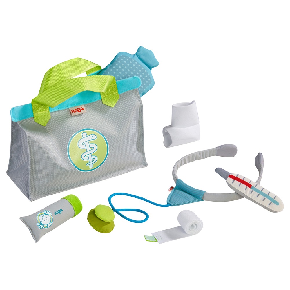 Όταν η αγαπημένη κούκλα του μικρού σας έχει υψηλή θερμοκρασία ή αν ο Τέντι τραυματιστεί στο πόδι του, η επίσκεψη του γιατρού είναι απαραίτητη. Ευτυχώς, το ιατρικό αυτό βαλιτσάκι της εταιρείας Haba περιέχει όλα όσα θα χρειαστεί: μπουκάλι ζεστού νερού, ελαστικό επίδεσμο, σωληνάριο αλοιφής, κλινικό θερμόμετρο, γύψο & στηθοσκόπιο. Αυτό το παιχνίδι ρόλων διδάσκει στα παιδιά ότι η επίσκεψη στον γιατρό δεν πρέπει να αποτελεί τραυματική εμπειρία. Κατάλληλο από 3 ετών και άνω. Διαστάσεις: 9 x 19 x 20 εκ.