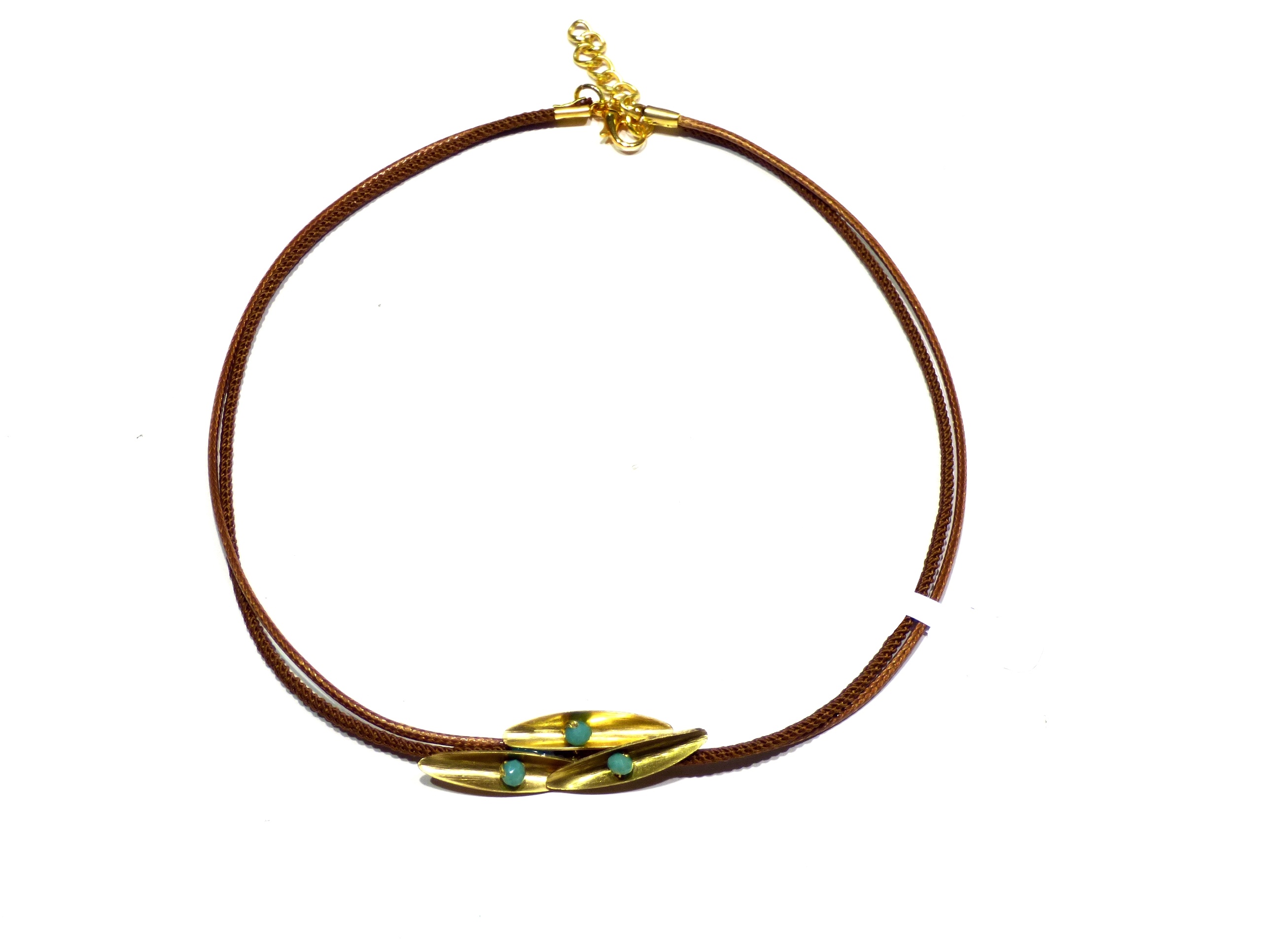 Κολιέ κοντό με συνθετικό κορδόνι και μεταλλικά στοιχεία.